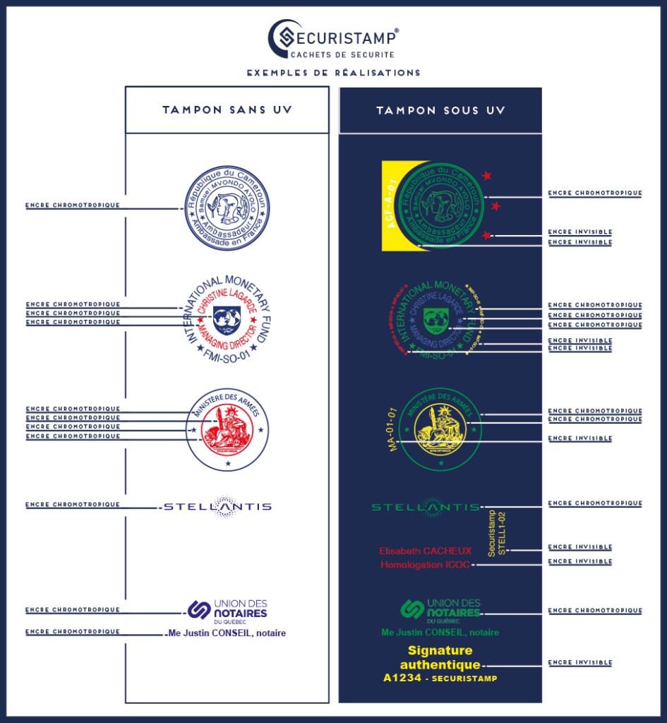 Le SECURISTAMP intègre des technologies brevetées qui rendent toute tentative de reproduction, d’effacement ou de modification quasi impossible. Ses encres spécifiques, ISO 9001:2015 dans le domaine “encres et fibres de sécurité” combinées à des éléments de sécurité discrets, garantissent une protection efficace et durable contre les fraudes documentaires.