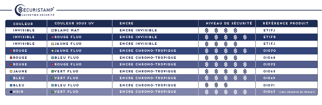 Le Securistamp a la forme d’un cachet rond, carré ou rectangulaire, avec plusieurs couleurs disponibles : Des encres chromotropes qui changent de teinte sous lampe UV fournie, des encres invisibles devenant jaune ou rouge et des encres anti stokes.